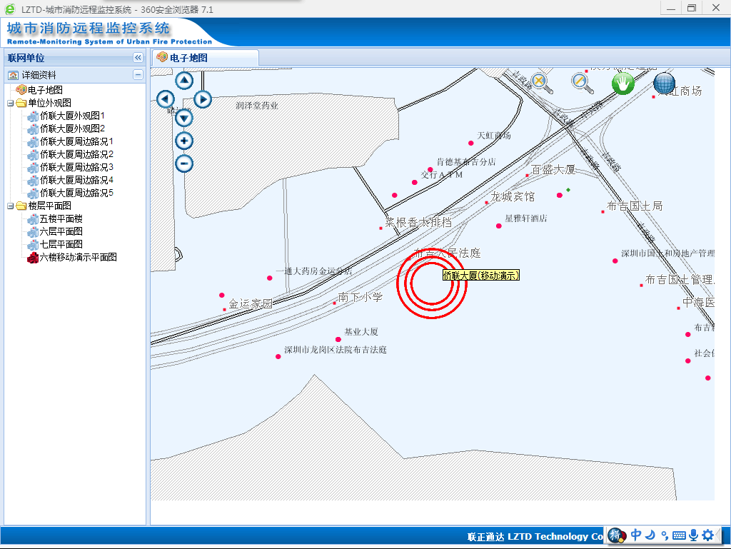 采用GIS技術(shù)(消防GIS),當(dāng)選擇任何一個聯(lián)網(wǎng)單位時,地圖系統(tǒng)自動顯示該單位在地圖上的具體位置。當(dāng)設(shè)備報告火警發(fā)生時,地圖會自動居中顯示聯(lián)網(wǎng)單位,并報以聲光警示。