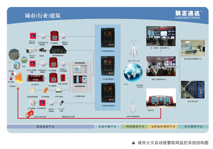 通過設(shè)在聯(lián)網(wǎng)用戶端的信息傳輸設(shè)備,從火災(zāi)自動報警設(shè)備上采集故障和火警信息,并通過無線/有線公共網(wǎng)絡(luò)傳輸?shù)奖O(jiān)控中心,監(jiān)控中心將收到的信息實時分析處理,進入相應(yīng)的處理流程(故障和火警),并將結(jié)果通報相關(guān)人員。