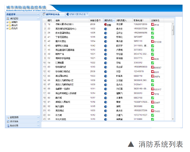 城市火災(zāi)自動報警聯(lián)網(wǎng)監(jiān)控系統(tǒng)利用公共通信網(wǎng),采用無線/有線通信方式,通過自主生產(chǎn)的火災(zāi)報警傳輸設(shè)備將各社會單位獨立運行的火災(zāi)自動報警系統(tǒng)進行統(tǒng)一聯(lián)網(wǎng),實時傳輸聯(lián)網(wǎng)用戶火災(zāi)自動報警系統(tǒng)及其相關(guān)消防系統(tǒng)的火災(zāi)、故障及運行狀態(tài)等情況,達到對聯(lián)網(wǎng)用戶的消防信息集中處理、實時監(jiān)控的目的。系統(tǒng)在10秒內(nèi)接收到聯(lián)網(wǎng)用戶火災(zāi)自動報警系統(tǒng)發(fā)出的火警信息,經(jīng)監(jiān)控中心確認(rèn)為真實火警后可自動傳送到119指揮系統(tǒng),并為消防部門提供發(fā)生火警單位的精確電子地圖位置、樓層平面圖、消防報警設(shè)備分布圖、周邊消防栓等消防資源分布圖、消防預(yù)案等信息,有效輔助消防部門快速反應(yīng),達到的“快速報警、迅速滅火”的目的。系統(tǒng)實時對聯(lián)網(wǎng)用戶的消防報警系統(tǒng)遠程監(jiān)控,及時發(fā)現(xiàn)設(shè)備故障;通過對聯(lián)網(wǎng)用戶值班人員的遠程查崗,監(jiān)督值班人員的在崗情況;系統(tǒng)還對聯(lián)網(wǎng)用戶的消防安全管理信息等進行管理,為公安消防部門和聯(lián)網(wǎng)用戶提供信息服務(wù),通過登錄系統(tǒng)平臺,消防管理部門可以實時監(jiān)控檢查重點消防單位的消防設(shè)施運行情況和人員值班情況,提高監(jiān)督執(zhí)法的針對性和有效性;聯(lián)網(wǎng)單位也可以登錄系統(tǒng)查詢自身單位消防設(shè)施運行情況的統(tǒng)計信息,建立消防檔案,制作滅火預(yù)案,開展網(wǎng)上培訓(xùn)、隱患登記整改等消防安全管理工作,提高單位自身的消防安全管理水平。